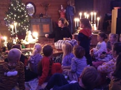 Kinderen komen in pyjama, nemen hun knuffel mee en verzamelen zich op de grond voor het podium in onze ruimte.